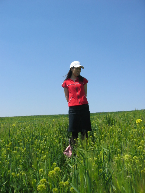색상대비 쥑이네요 ~ 파란하늘 녹색들판 빨간셔츠 검정치마 그리고 하얀모자